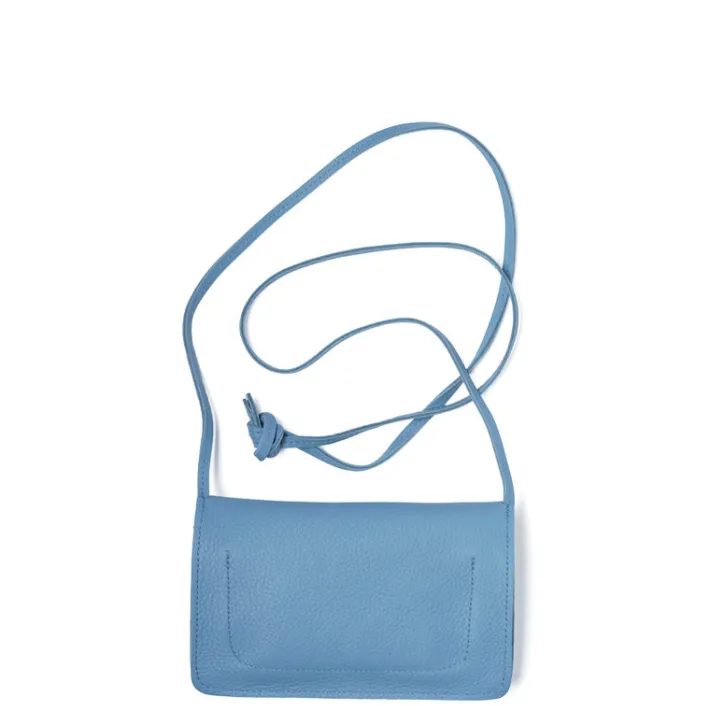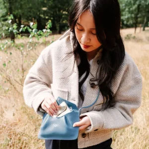 The Backing Vocals is an envelope bag, but not in the traditional sense. That’s because we’ve added a shoulder strap for comfortable carrying. You can adjust the strap to your preferred length by tying a knot in it. This Painters Blue leather shoulder bag is nice and lightweight. It’s ideal for going clubbing. The print on the inside is of three nightingales. So you’ve always got your own backing vocalists with you.