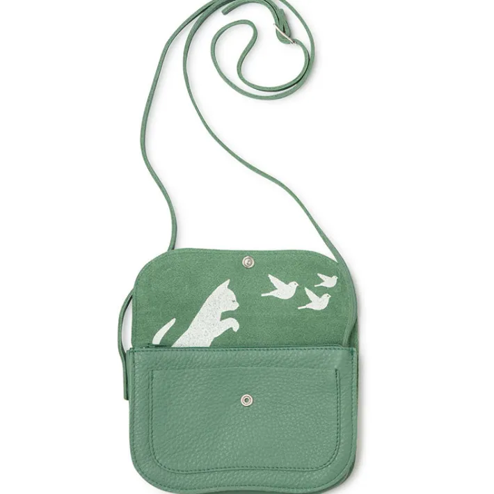 This bag will last you for years. It’s made of durable Italian leather which has been treated so that it needs little maintenance. It can also withstand rain. Water runs straight off your bag. The inspiration for the silkscreen print on the inside, was Moos, the Keecie cat, who fortunately doesn’t much like birds. Our Cat Chase wallets have the same print. There’s a link in the details.