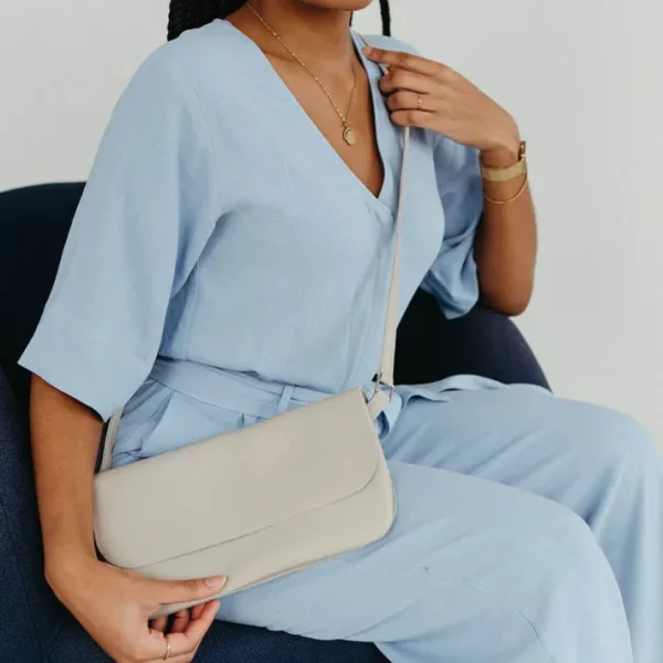 And because we don’t like having to search for things either, we’ve added a special pocket at the back of this cement coloured bag for your most frequently used card. This convenient card holder is ideal, for example, for your public transport card on the go. And thanks to the adjustable strap, you can wear our medium-sized shoulder bag any way you like: as a fanny pack on the front, a sling bag on the back, or simply hanging over your shoulder.