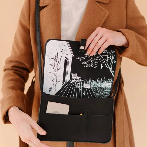 Whatever your day looks like, with this Black leather satchel you’re always ready to drop everything for a while and go and recharge somewhere. Even just opening this bag already gives you a breather. That’s because there’s a lovely quiet spot in the garden hidden on the inside.