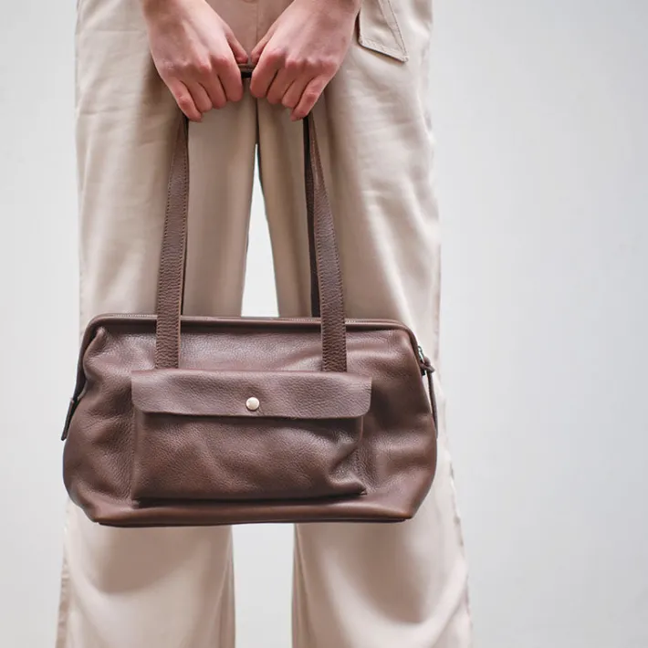 You might have noticed that the Room Service model is based on a classic doctor’s bag. Characteristic for this type of bag is its fold-out opening frame, creating an extra large inside area. The Keecie twist to this bag is that we’ve added long handles, enabling you to comfortably carry the bag on your shoulder. Inside there is an additional compartment and there’s a compartment with a popper fastener on the outside. For your stethoscope…