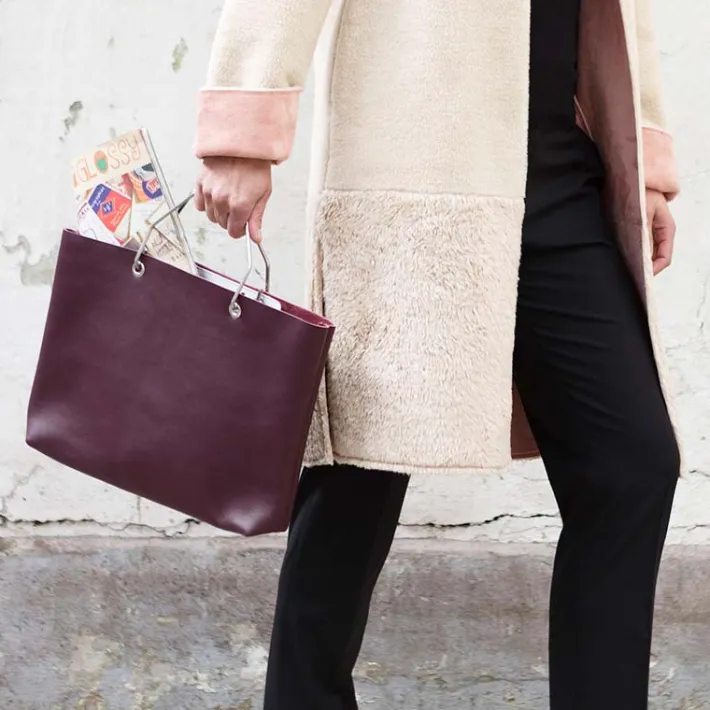 You can carry a lot of groceries in this Aubergine leather shopper. No more plastic bags when you go to the market on Saturday. It’s easy to hang this durable leather bag by its steel handles on the handlebars of your bike.