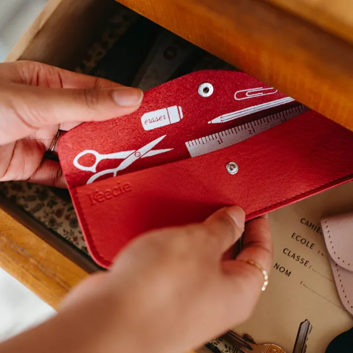 The Pen Pal is flat-stitched. It’s just like a narrow envelope, so it fits snugly for example in your Lazy Boy crossbody bag. The pencil case is made of robust leather, so you can also use it to hold a small pair of scissors with sharp points. The leather comes from Italy and has been treated so that it will last for years and hardly requires any maintenance.