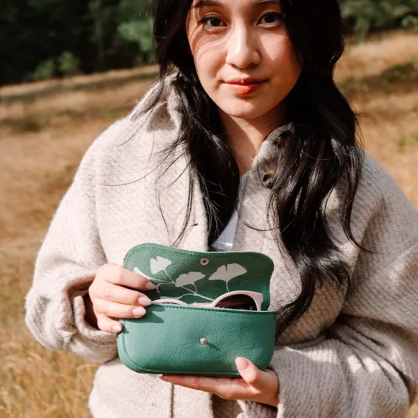 The front is made from a double layer of leather, so your shades are well protected. On the inside, of course, there’s a silkscreen print – that little bit extra for which Keecie is known. This time we’ve selected a print of a leaf from the Ginkgo tree. In China and Japan this is a sacred tree that symbolises peace and hope.