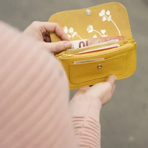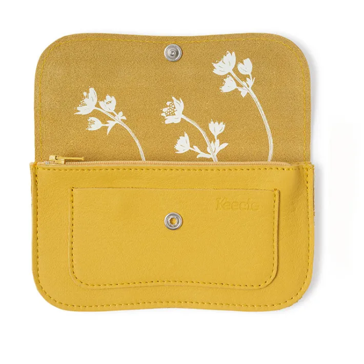 The Flash Forward was designed in honour of Keecie’s 12½ year anniversary. It’s the same model as the Cat Chase medium, but with a brand-new print. On the inside of this Yellow leather women’s purse is one of our favourite plants: the Great Masterwort. If you look closely at this delicate flower you’ll see it consists of a collection of minuscule flowers.